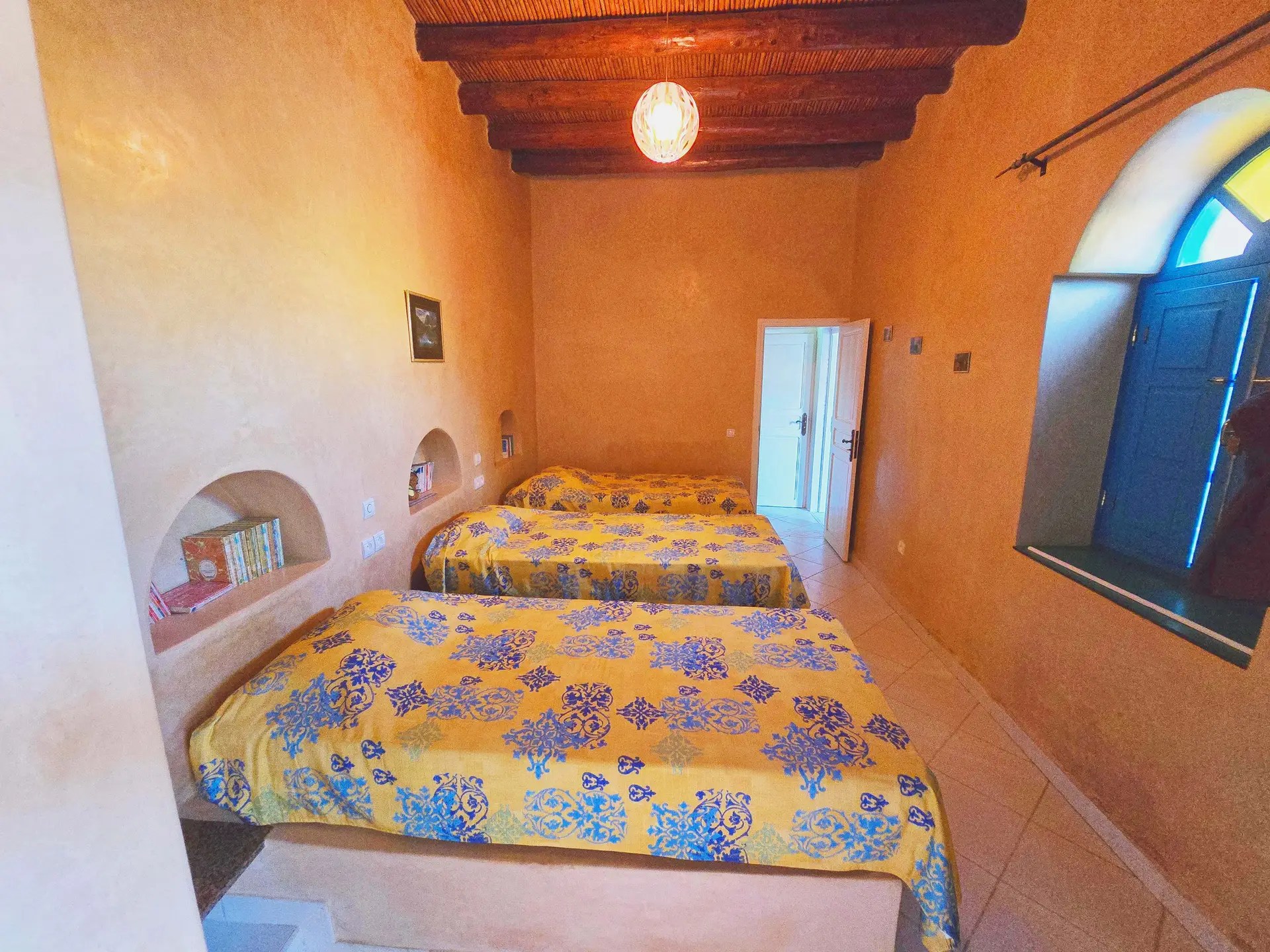 Accommodation includes three luxurious master suites, each featuring its own private en-suite bathroom, designed to offer privacy, comfort, and authentic Moroccan charm. Additionally, a children’s bedroom with three beds provides extra space for family or guests.
